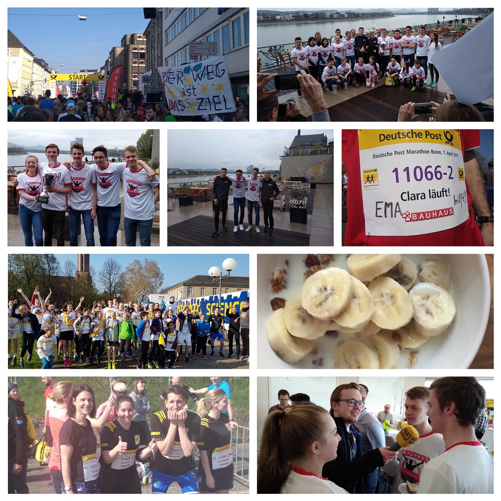 Herzlichen Glückwunsch an alle LäuferInnen des diesjährigen Staffel-Schulmarathons in Bonn! Bei strahlendem Sonnenschein erreichten alle zehn Schüler- und Lehrerstaffeln souverän das Ziel! Die schnellste Schülerstaffel überschritt nach sensationellen 3:27:33 die Ziellinie und sicherte sich damit den 10. Platz ihrer Wertungsklasse und den 40. Gesamtplatz von insgesamt 276 Staffeln. Mit 3:25:55 verteidigte die „Clara gewinnt“ Lehrerstaffel ihren Namen und belegte nahezu souverän einen Platz und 35 Sekunden vor der Schulleiterstaffel den 21. Gesamtplatz von insgesamt 232 Staffeln.