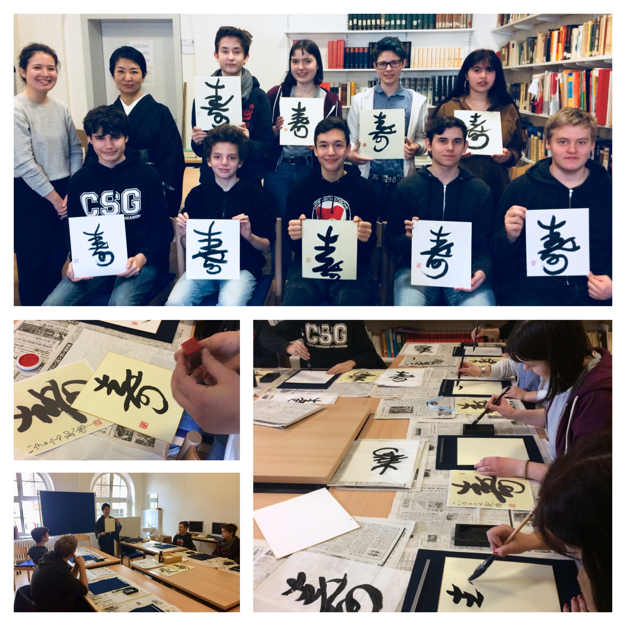 Am Mittwoch, den 20. März, nahm unsere Japan AG unter der Leitung von Frau Lutz an einem Workshop zum Thema japanische Kalligrafie teil. Nachdem die japanische Dozentin Frau Aya Murakami uns in ihrem Kimono begrüßt hatte, fingen wir an, das Malen von Schriftzeichen zu üben. Als Erstes sollten wir an unserer Körperhaltung arbeiten und die richtige Körperposition einnehmen, da japanische Kalligrafie nicht nur eine Kunstform, sondern auch eine Zeremonie zur inneren Ruhe und zur Konzentration ist. Die nächsten 45 Minuten übten wir die Pinselführung an dem Schriftzeichen des "ewigen Glücks". Am Ende der Stunde malten wir unsere Zeichen mit Tusche auf verziertes Reispapier und stempelten es abschließend mit einem traditionellen japanischen Siegel (Hanko). Die Ergebnisse waren für die kurze Zeit sehr zufriedenstellend und es hat allen sehr viel Spaß gemacht.