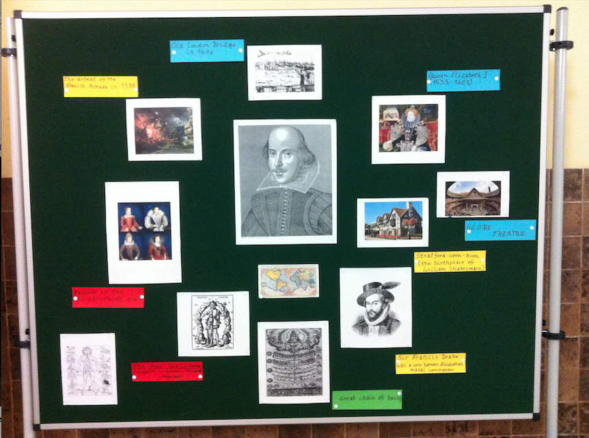 .So zeigten die LKs von Frau Probst und Frau Schmitt „Romeo and Juliet“ mit einer hinreißenden Frau Probst, die kurzfristig als Julia einsprang. Außerdem versuchte sich die Klasse 7c an „The taming of the shrew“ (Der Widerspenstigen Zähmung) und Frau Wimmers Musik GK an „A Midsummernight’s Dream“. Einen musikalischen Beitrag zur Shakespearezeit leistete der GK von Frau Weiß mit John Dowlands „Come again“. Zudem gab es eine wahre Flut von Shakespeareportraits, Bildern aus Shakespeareinszenierungen, Lernplakaten (LK Brauweiler) und Zitaten, die im ganzen Haus aufgehängt wurden.
