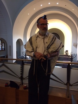 Ganz praktisch wurde auch das Anbringen des Gebetsriemens und der Kapsel vorgeführt und erläutert. Die Torarollen und die Menora konnten ebenfalls aus nächster Nähe betrachtet werden, so dass die im Unterricht zuvor behandelten Inhalte den Schülerinnen und Schülern veranschaulicht werden konnten.