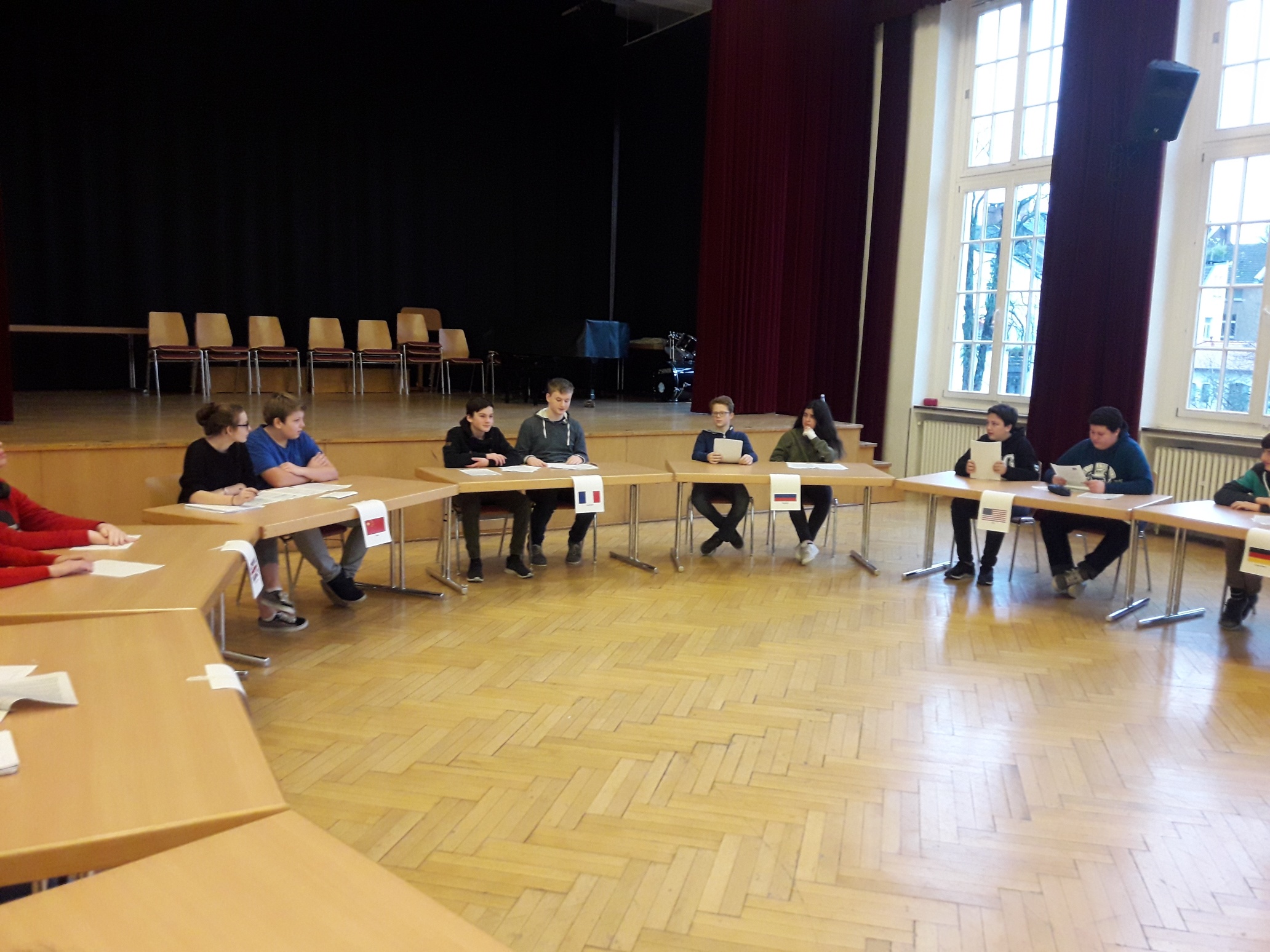 Gut. Es war zwar (noch) nicht das UN-Gebäude in New York, sondern die Aula des Clara-Schumann-Gymnasiums. Aber immerhin...die 9a simulierte mit Herrn Hienzsch und Herrn Leyhe sehr lebensnah eine Sitzung des UN-Sicherheitsrats. Ein "imaginärer" Fall, der allerdings sehr nah angelehnt war an reale Geschehnisse. Die Schüler übernahmen unterschiedliche Rollen, z.B. die der "Veto-Mächte". Erscheint es manchem so, dass dieses Gremium unglaublich schwerfällig, träge und kaum zu Entscheidungen fähig ist, konnten die Schüler die Wirklichkeit "nachfühlen". Sie machten die Erfahrung, dass Kompromissvorschläge einfach abgebügelt werden und dass die "Sache" längst nicht immer im Vordergrund steht. Das Ganze noch in einer teilweise sehr turbulenten Runde, in der es schwer fiel, das Gegenüber ausreden zu lassen. Dank der ausgezeichneten Sitzungsleitung eines Schülers gelang das aber sehr gut. Und bei welcher Gelegenheit wollen Schüler 20 Minuten länger als geplant verhandeln, nachdem der Lehrer schon längst zum Ende kommen wollte?