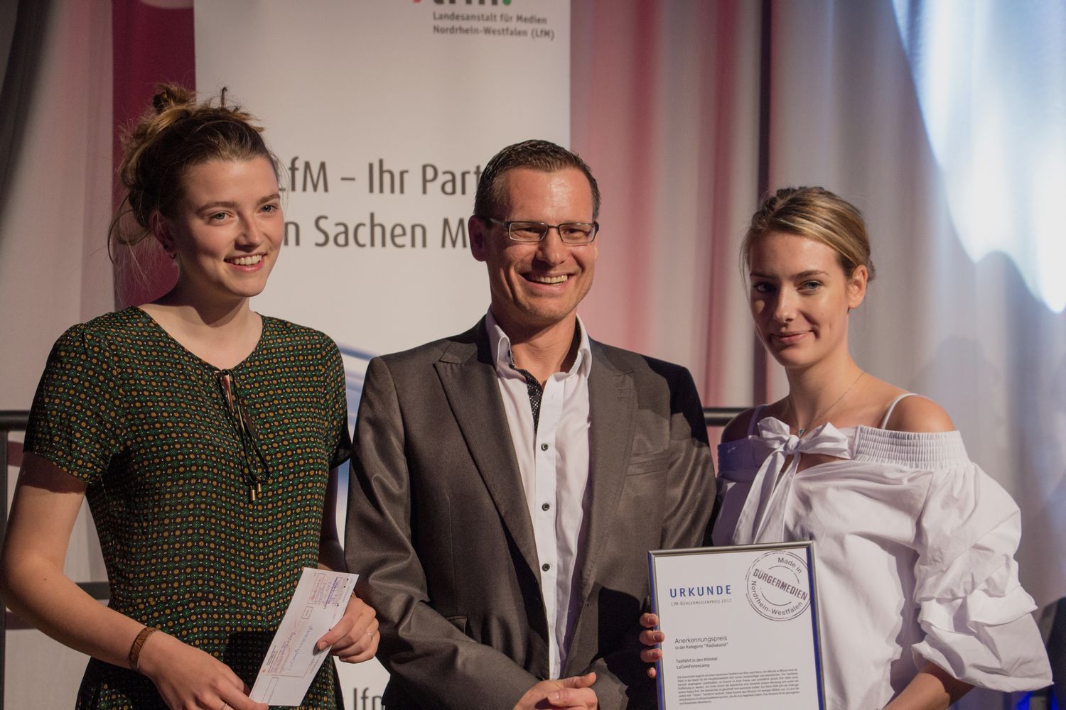 Die Q2-Schülerinnen Rebecca Silbernik und Paula Veenema haben mit ihrem Hörspiel "Taxifahrt in den Himmel" den 2. Platz beim Bürgermedienpreis der Landesanstalt für Medien (LfM) in der Kategorie "Radiokunst" belegt. Das Hörspiel hatten die beiden Schülerinnen im vergangenen Schuljahr im Rahmen des Radio-Projektkurses in Zusammenarbeit mit der LoCom Medienakademie erstellt. Der Beitrag wurde im Bürgerfunk des Senders Radio Bonn/Rhein-Sieg ausgestrahlt.