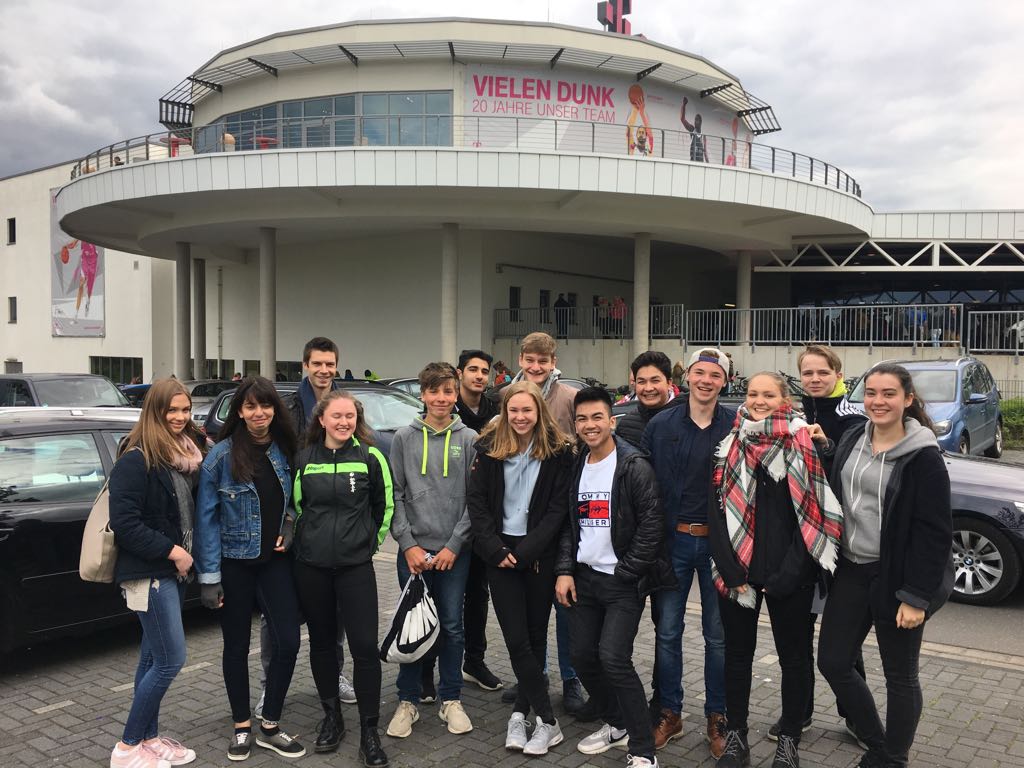 13 Schülerinnen und Schüler der Basketball-AG besuchten am Sonntag, den 23. April das Heimspiel der Telekom Baskets Bonn gegen die BG Göttingen. Während die Bonner mit einem Sieg (5. Platz) den Einzug in die Playoffs perfekt machen konnten, ging es für die Göttinger nur noch um die „goldene Ananas“. Nach einer ausgeglichenen Anfangsphase übernahmen die Gäste aus Niedersachsen die Führung und bauten diese auf zwischenzeitlich zwölf Punkte aus. Die Baskets kämpften sich im dritten Viertel zurück ins Spiel. Der Spielstand von 64:64 fünf Minuten vor Schluss versprach eine enge Schlussphase. Während die Baskets Wurf um Wurf verfehlten, trafen die Gäste sicherer und gewannen schließlich deutlich mit 78:66.