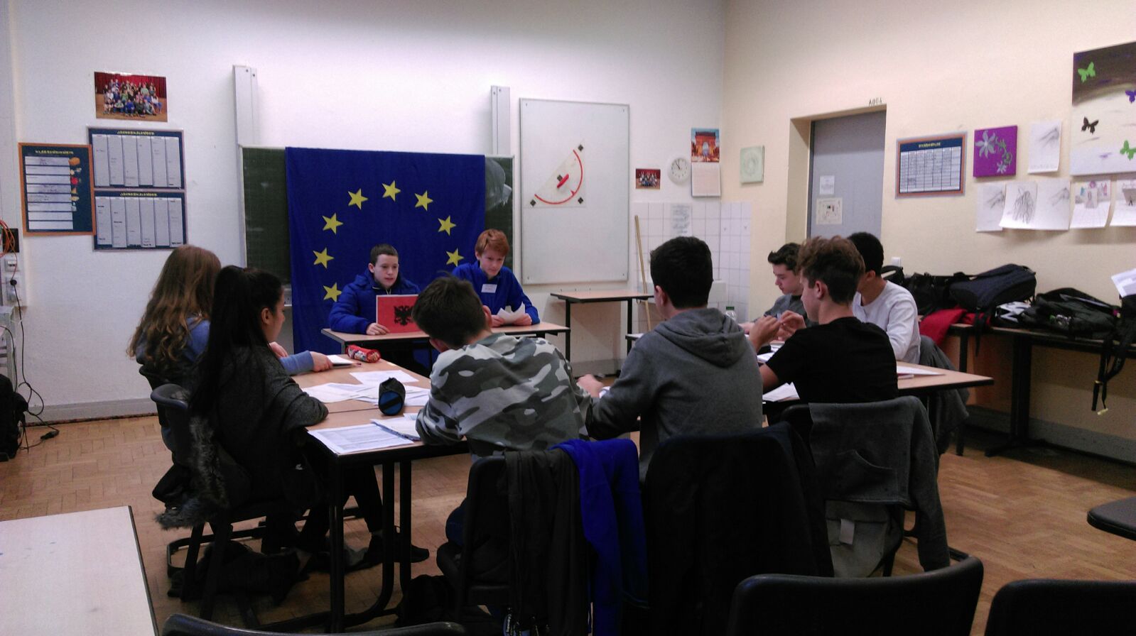 Planspiel in der 9a von Frau Weber als Vorbereitung für die Klassenfahrt nach Straßburg: Der Balkan („Balkan-Route“) ist nicht nur ein aktuelles Thema, das neuerdings überall im Gespräch ist. Die Balkan-Länder Albanien, Mazedonien und Serbien streben langfristig in die Europäische Union. Die Schüler werden zu Außenministern, Parlamentsabgeordneten und Vertretern der Europäischen Kommission. Am Ende, nach zwei Tagen engagierten Rollenstudiums und Verhandlungen, entscheiden die Schüler, dass Serbien mit dabei sein wird und Mazedonien sowie Albanien noch warten müssen. Serbien „gewinnt“. Aber der wahre Gewinner ist ein vereintes Europa.